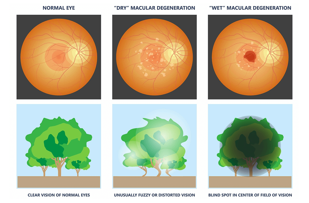 In the advanced stage, in addition to drusen, vision loss can occur due to excess fluid and blood (wet AMD) and/or the death of retinal cells, known as geographic atrophy (GA).